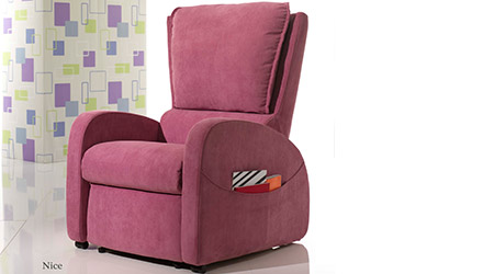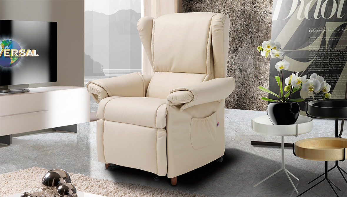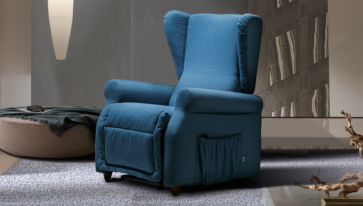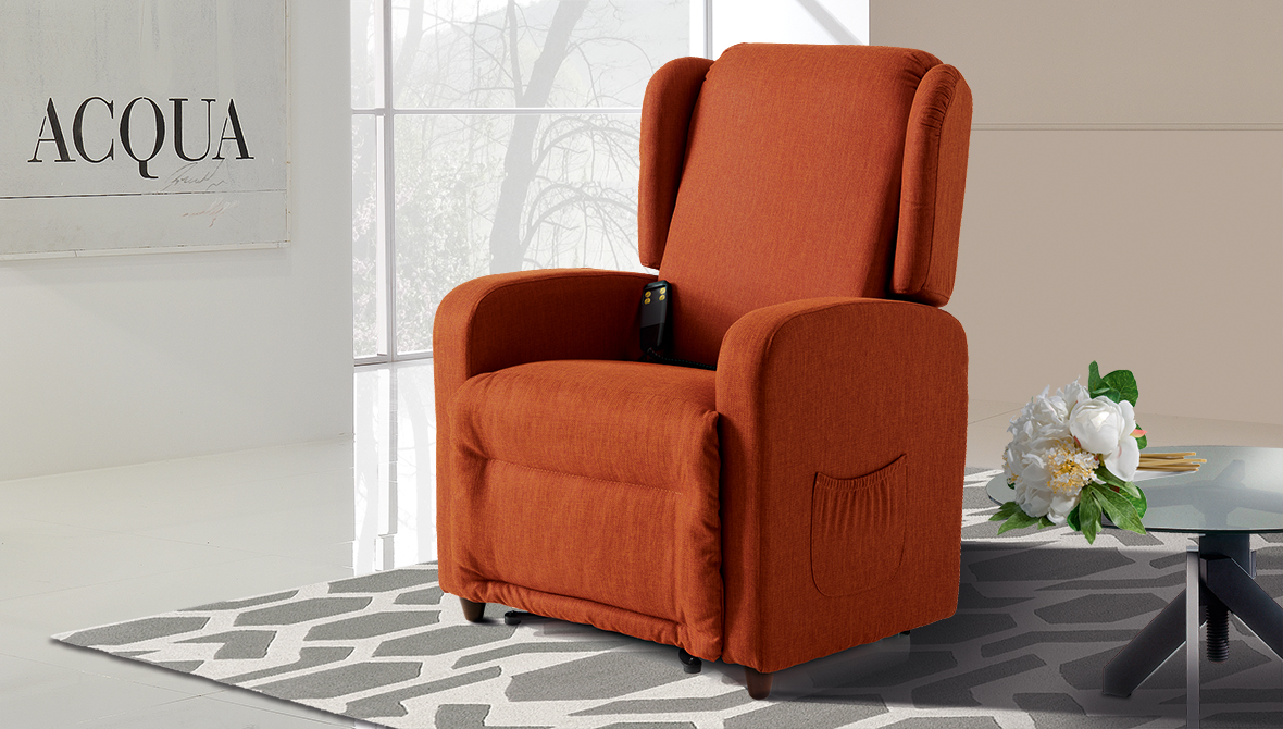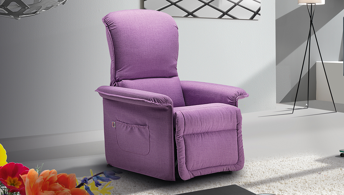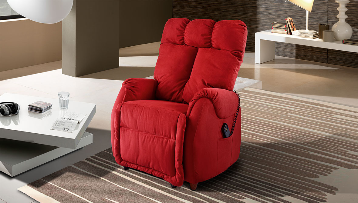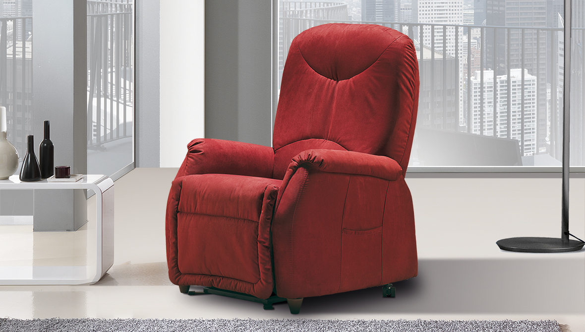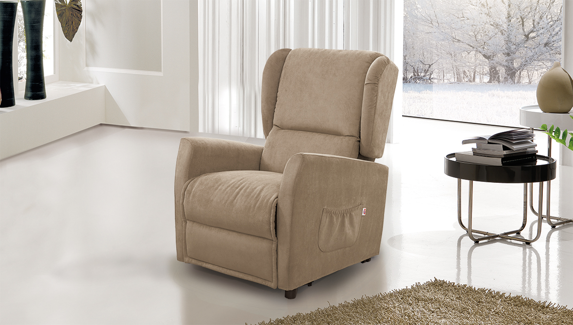 Poltrona relax per eccellenza, perfetta in ogni ambiente della casa è realizzata con struttura in legno di Abete e multistrato di prima scelta. La struttura del piano seduta è un telaio metallico con cinghie elastiche intrecciate.Sollevamento in verticale di 15 cm.