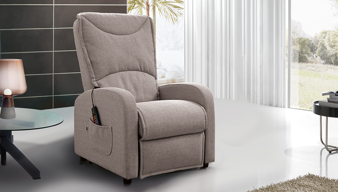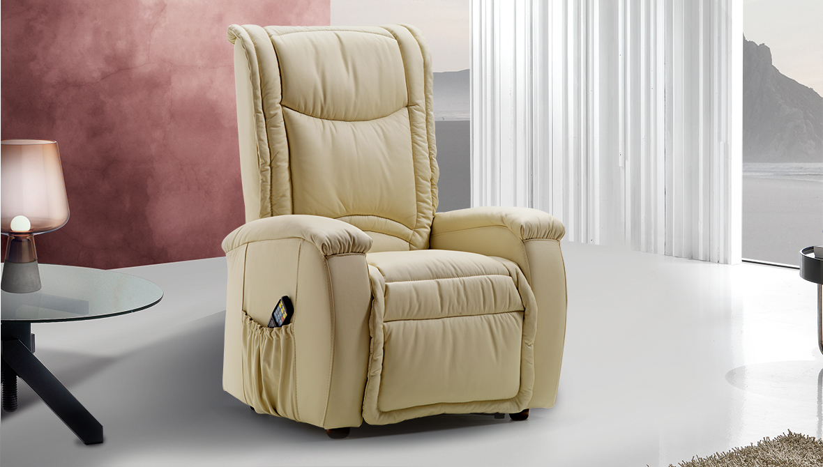 COD.3Forme morbide ed elegantiQuesta poltrona è dotata di un meccanismo elettrico ad un motore. Apertura basculante con scivolamento in avanti, lo schienale inizia a reclinarsi quando la pediera è completamente alzata. Massaggio stretching, kneding, tapping sia separati che combinati, su 3 livelli della schiena + pediera.