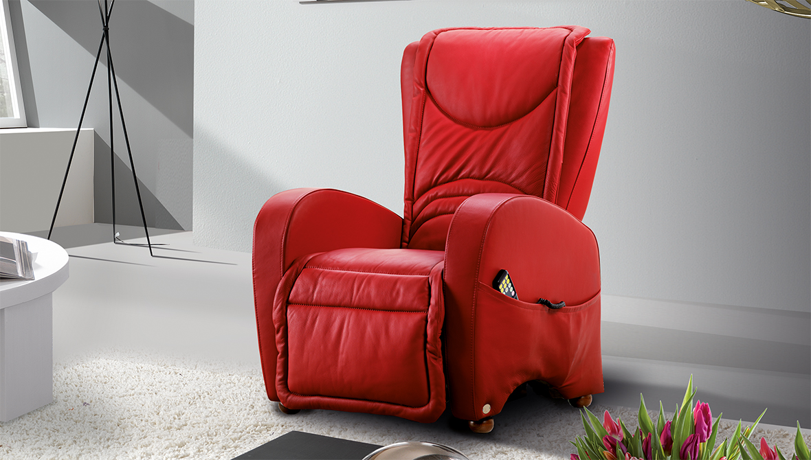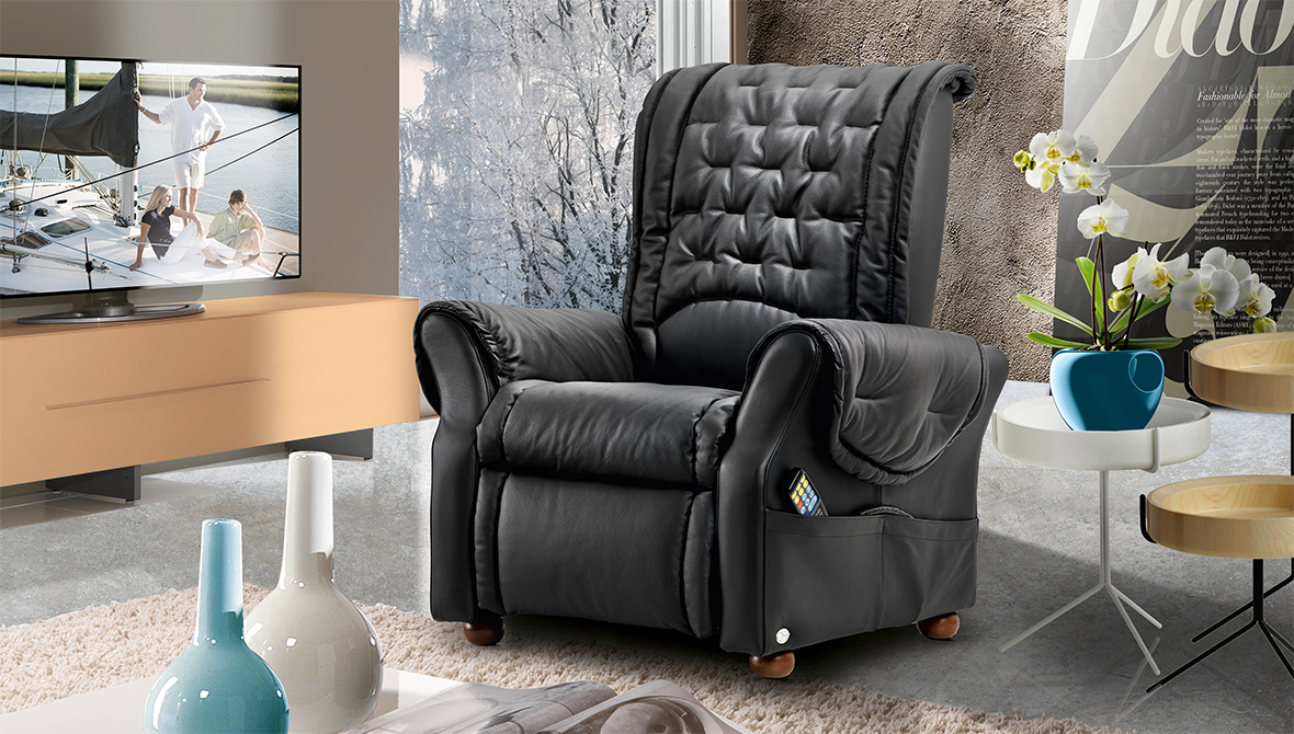 COD.7Un comodo abbraccioQuesta poltrona è dotata di un meccanismo elettrico a due motori e la posizione relax TV si ottiene con movimento indipendente della pediera rispetto allo schienale. Nello schienale viene inserito il massaggio shiatsu su 3 livelli della schiena + 1 vibromassaggio sulla pediera.